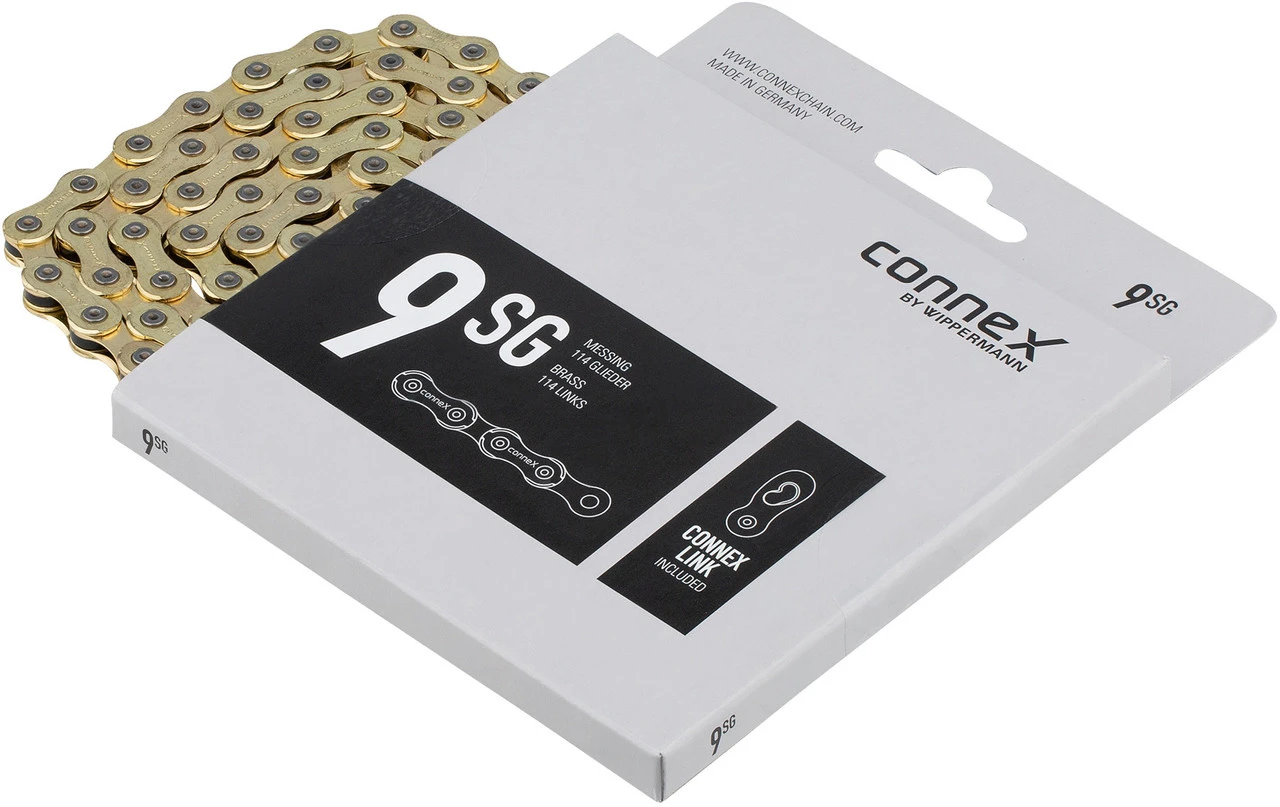 Das goldfarbene Erscheinungsbild und die hochwertige Messingbeschichtung der Connex 9sG bietet einen zuverlässigen Korrosionsschutz. Die extrem ausgeformten Außenlaschen der Connex 9sG versprechen eine langlebige Kraftübertragung. Durch das im Lieferumfang enthaltene Connex Link Kettenschloss (de-)montierst Du die Kette werkzeuglos im Handumdrehen.